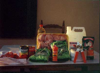 Huhn, Kaninchen, grüne Bohnen, weiße Bohnen, Tomatengatsche, Öl, Knoblauch, Paprika, Paella Gewürz, Reis, Salz, Wasser.